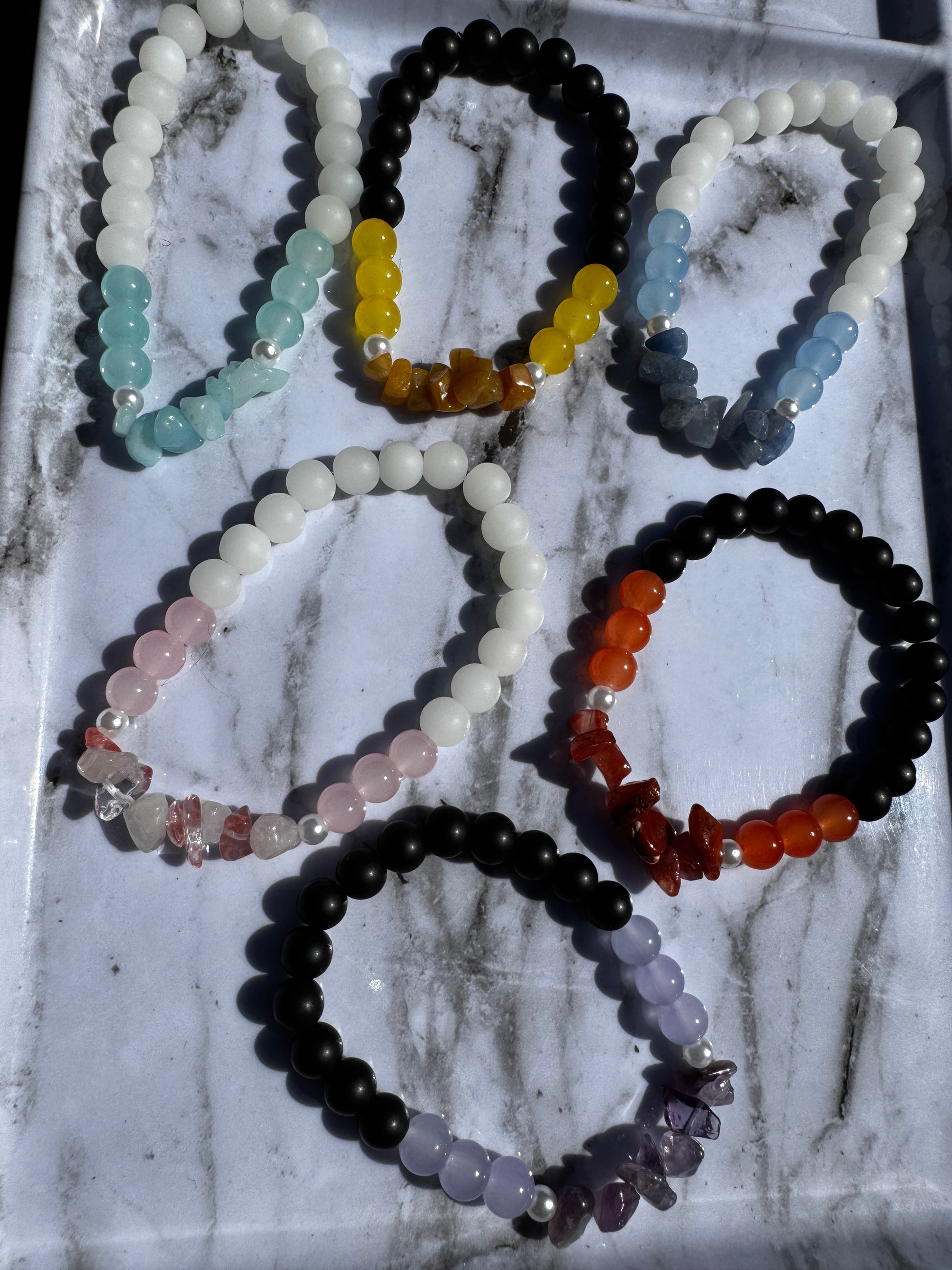 Gemstone chips paired with frosted or glossy beads create soothing, balanced color palettes. Each bracelet feels like a wearable energy shift, perfect for stacking or wearing solo when you need a little calm.