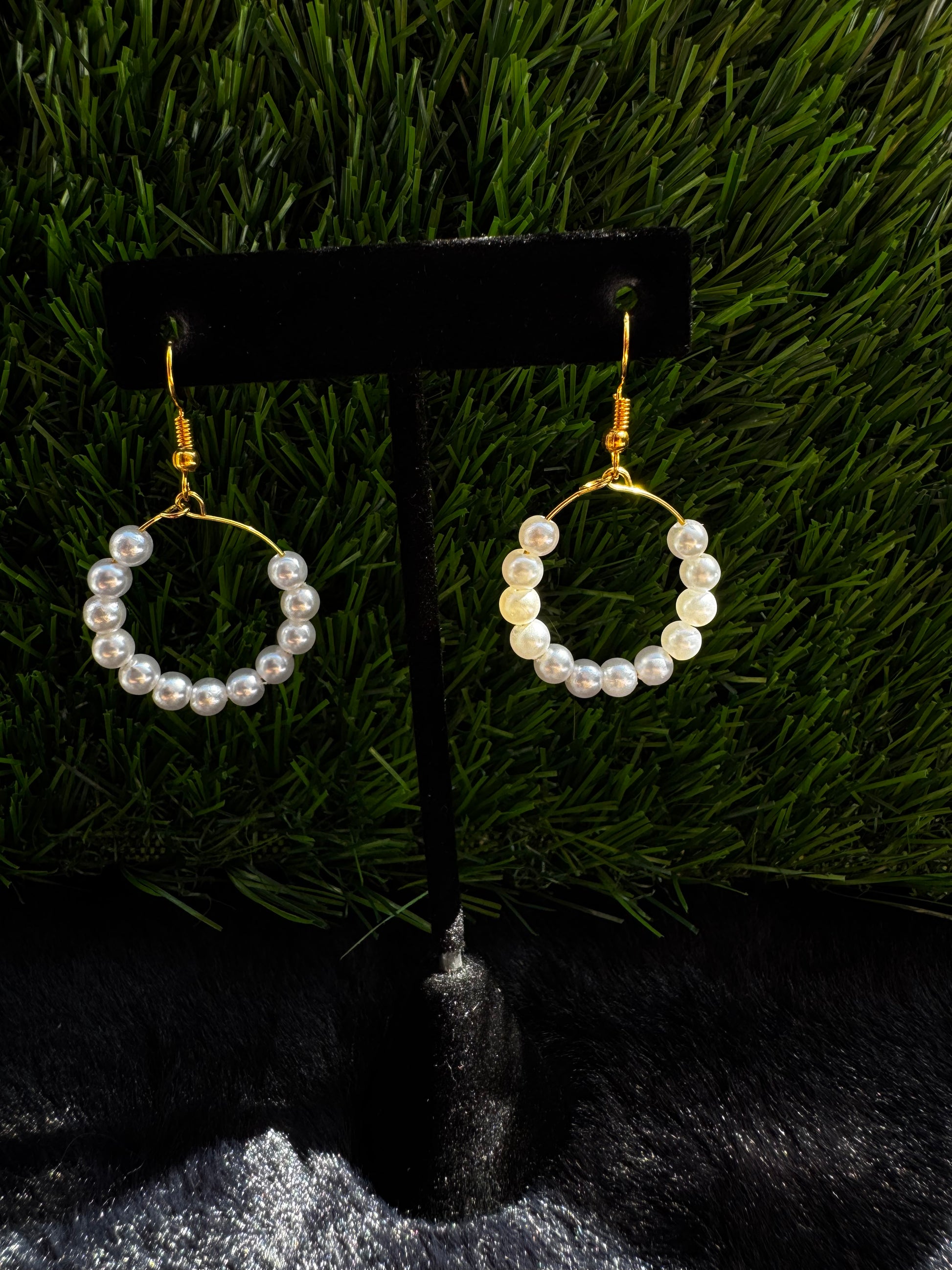 Classic hoops reimagined with white faux pearls strung into airy hoops on gold alloy hooks. A polished yet playful statement that works for everyday or dress-up.